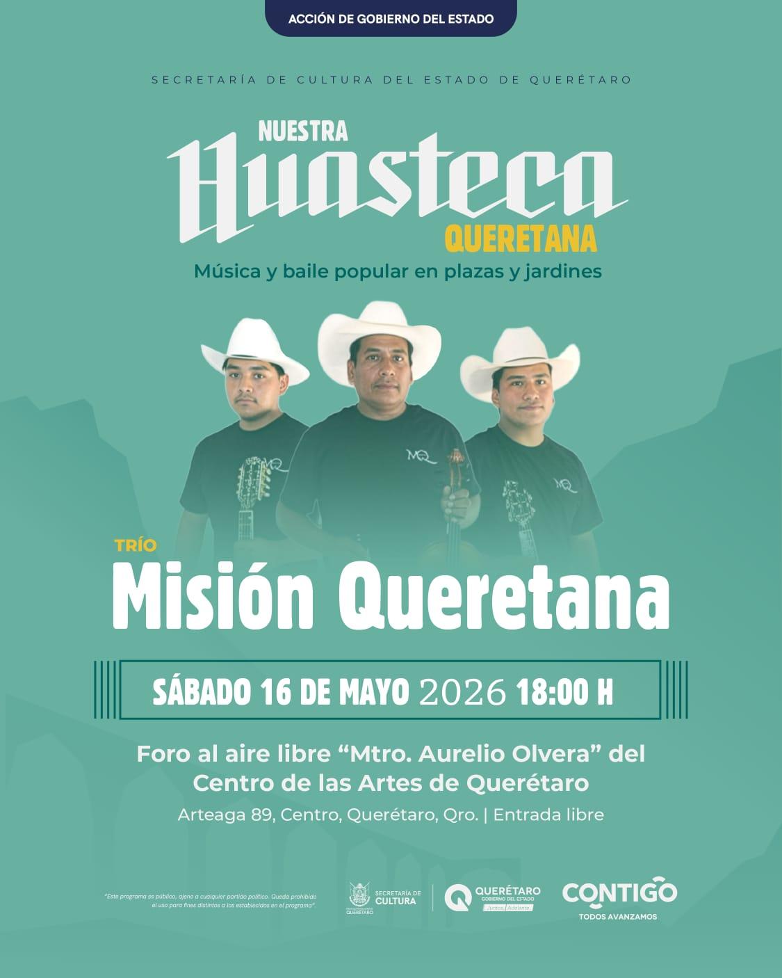 ¡La tradición suena fuerte en Querétaro! Acompaña al Trío Misión Queretana en una tarde dedicada a nuestra música y raíces. Ven con toda tu familia a disfrutar de \"Nuestra Huasteca Queretana\", una muestra vibrante de música y baile popular en un escenario inmejorable.